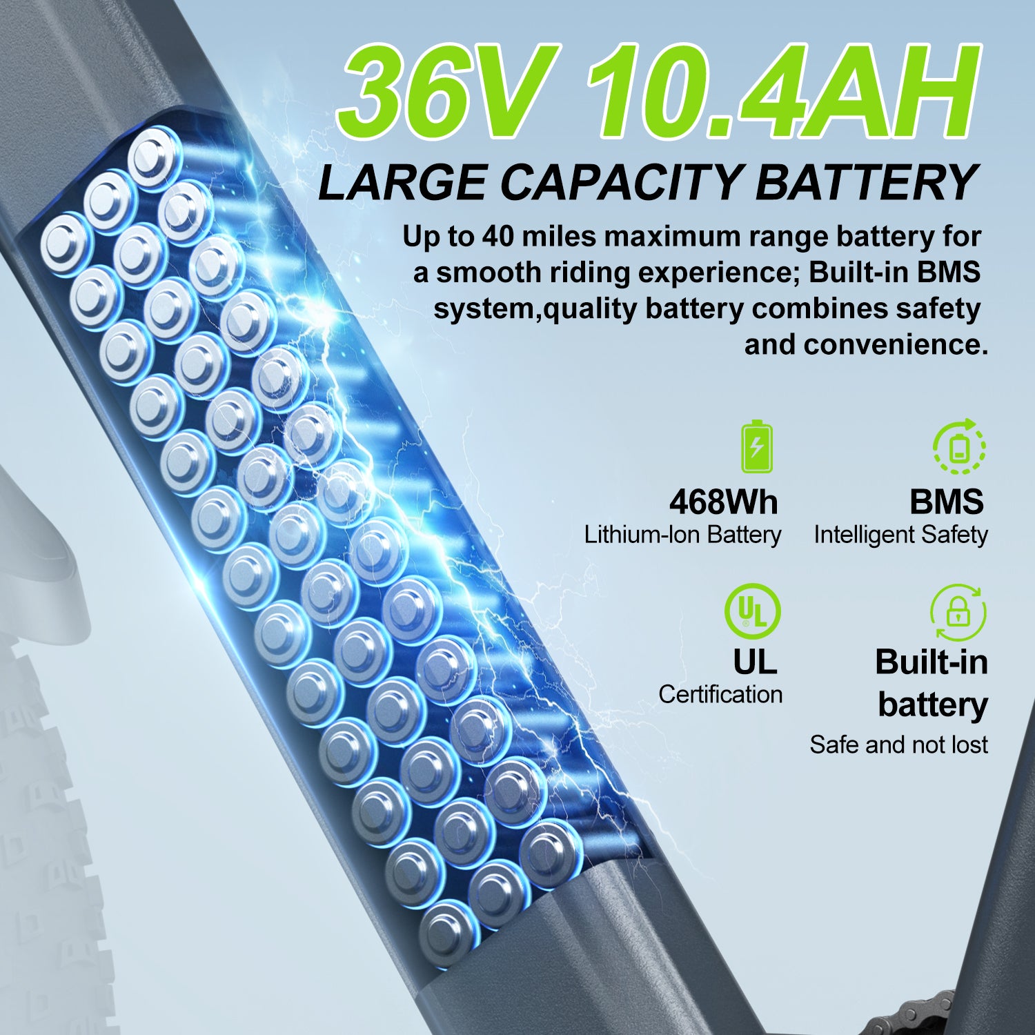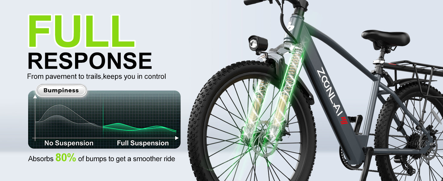 Ride with confidence using the Zoonlai 36V 10.4Ah hidden lithium battery — beautifully integrated for a sleek look and enhanced safety. Equipped with advanced BMS protection, it ensures stable power delivery and long-lasting performance. Enjoy up to 23 miles in pure electric mode or 40 miles with pedal assist, and recharge in just 4–5 hours.
